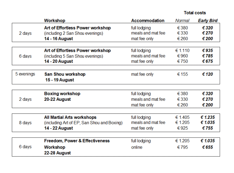 The Ending Unnecessary Suffering workshop only offers full lodging (€75 /day). The first week of martial workshops has several options. The first is full lodging including meals and mat fee (€75 /day). The second is only meals and mat fee (€55 /day). And the third is only a mat fee (€20 /day).