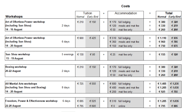 Here is an overview of all workshop costs. Make sure to note they all include costs for tuition and accommodation. For some workshops the accommodation costs have options. The first is full lodging (including sleeping, meals and mat fee) at €85 per day. The second is meals and mat fee for €60 per day. And the third is only a mat fee for €25 per day. The Early Bird discount is on tuition costs only. We offer this Early Bird if you register before May 1st!
